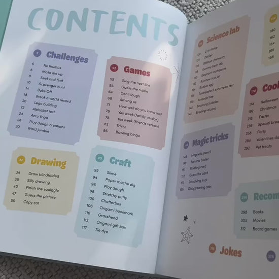 Activities include fun challenges and games, drawing, magic tricks, cooking/baking, science experiments, card games, craft, book/movie/board game recommendations, and more!